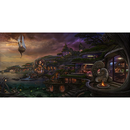 根底にあるテーマは『共存共栄』。幻想的な街並みや妖獣・神獣たちの住まう森など確かな技術で繊細かつ緻密に描かれる独創的な世界観は見る者を作品世界に引き込み、国内外のファンを魅了し続けています。
